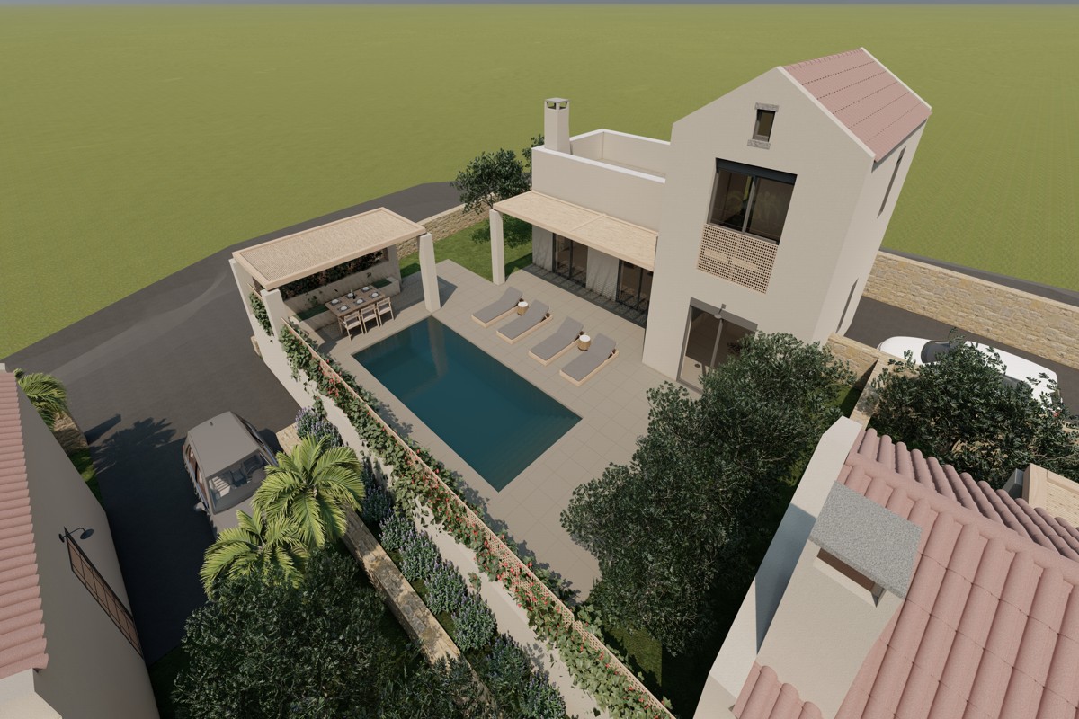 This is an amazing maisonette for sale in Apokoronas, Chania Crete, located in the lively village of Vamos. It has a total living space of 97 m², sitting on a 408 m² private plot. It is developed over 2 levels, and it consists of 2 bedrooms and 2 bathrooms. On the ground floor there is an open-plan kitchen, the living room, and one bathroom. Additionally, it features large balcony doors providing direct access to the pergola-covered area and the swimming pool.