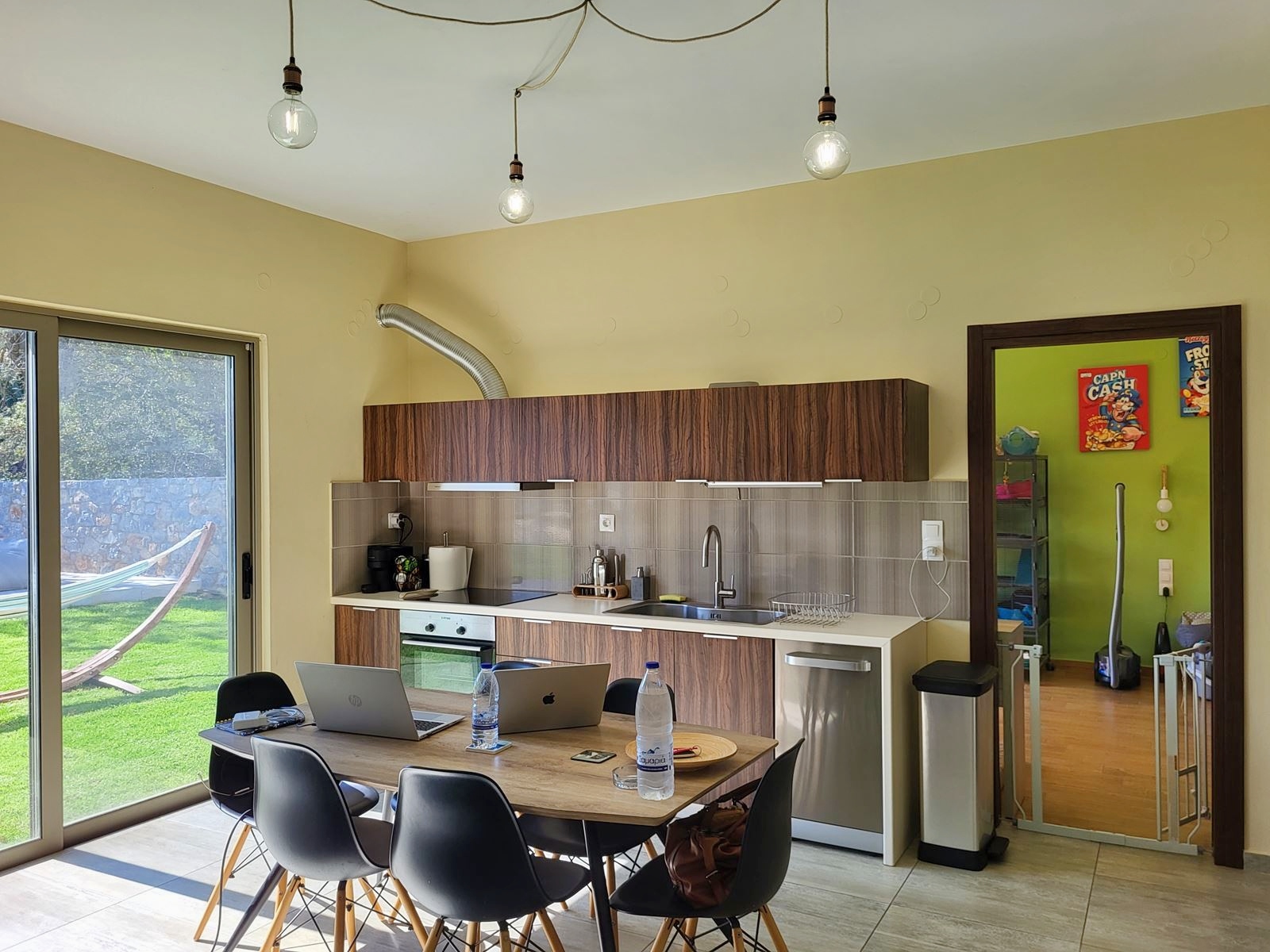 The well-manicured lawns envelop the large saltwater swimming pool, extending gracefully into sunbathing and BBQ areas that feel like a welcoming carpet. The villa itself is a three-part structure, with the central portion rising above the left and right sections, crowned by a pitched roof. The entire structure is adorned with expansive double-glazed, aluminum sliding doors and windows, seamlessly merging the beautiful outdoors with the interior spaces and allowing the natural sunlight to flood in.